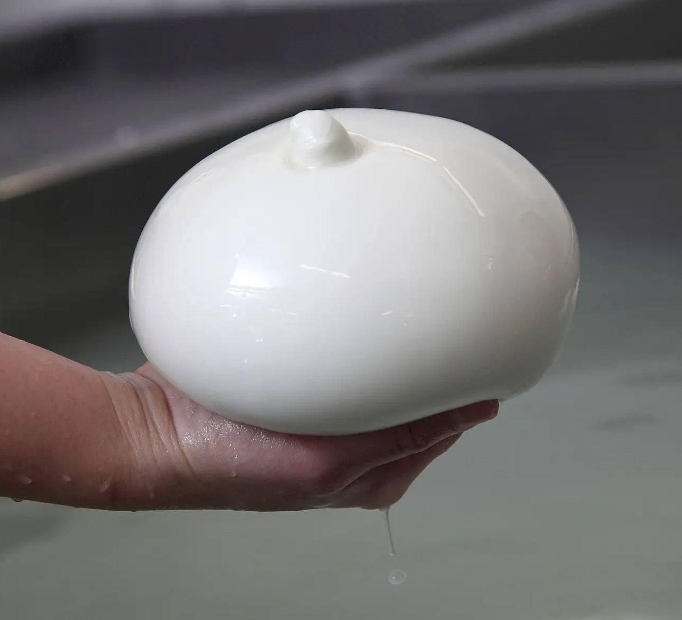 Mozzarella is a stretched curd cheese, a style known in Italy as ‘pasta filata’ or ‘spun paste’. In this process the cheese curds are heated in water at 70-80C, stretched into strands, then kneaded into shape. Their mozzarella balls are still shaped by hand. Most producers use machines to do this job.