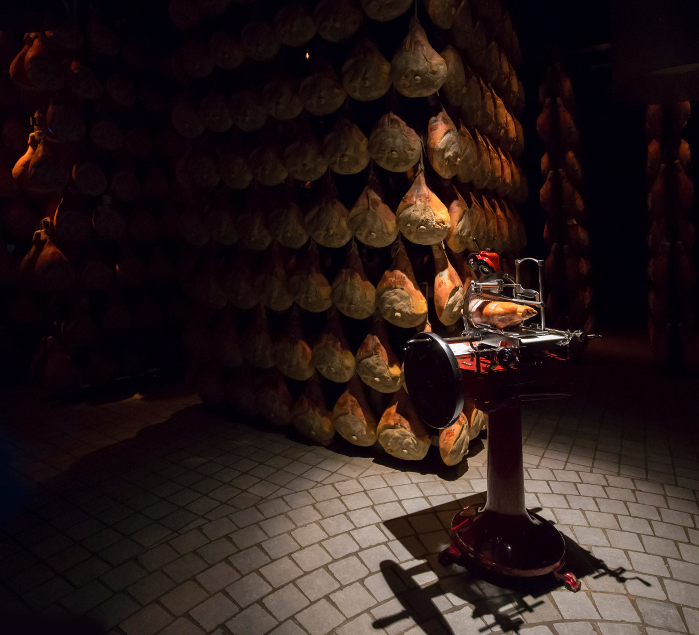 The Galloni tasting hall, with hundreds of hams hanging up to the rafters, and with the music and light show, is a remarkable experience.